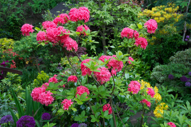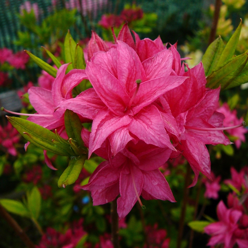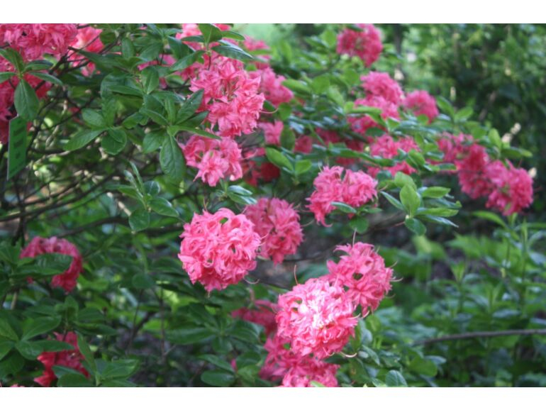 Die Azalee HOMEBUSH ist eine der schönsten verholzenden Azaleen mit großen, langstieligen Blüten in einem auffallenden Rosa. Die Blüten wachsen kugelförmig und bilden zusammen mit dem attraktiven grünen Laub einen interessanten Kontrast. Sie blüht von Mai bis Juni und wird bis zu 2 m hoch und genauso breit. Laubabwerfende Azaleen sind Heidepflanzen, die im Gegensatz zu den japanischen Azaleen volle Sonne lieben, sofern wir ihnen einen gleichmäßig feuchten, sauren Boden mit einem pH-Wert zwischen 4 und 5 bieten. Sie bevorzugen einen leichten, nicht kalkhaltigen, durchlässigen Boden mit Torf, Kompost und einer holzigen Mulchschicht an der Oberfläche. Schwere Böden werden durch Zugabe von Sand und feinem Borax aufgehellt. In schweren Lehmböden ist eine gute Drainage wichtig. Schneiden Sie die Blütenbüschel sofort nach der Blüte ab. Die Wurzeln dürfen nicht austrocknen.