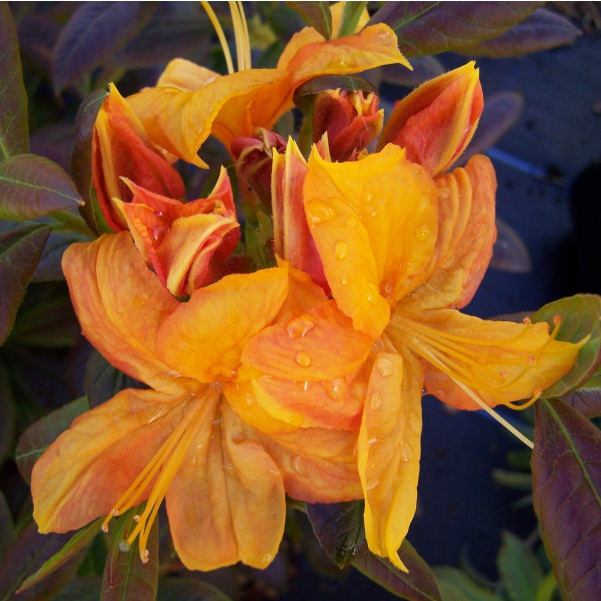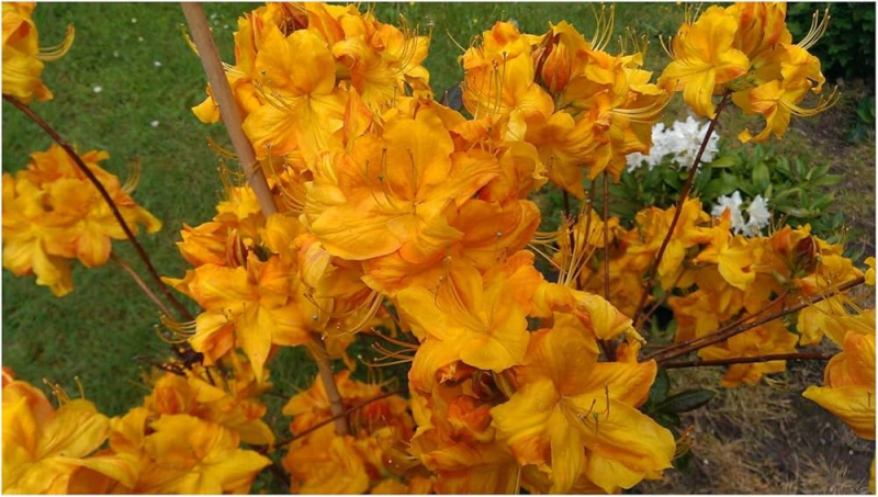 Wunderschöne Azalee mit schönen Blüten von tief gold-oranger Farbe. Blüht von Mai bis Juni und wird bis zu 2 m hoch und genauso breit. Laubabwerfende Azaleen sind Heidepflanzen, die im Gegensatz zu den japanischen Azaleen volle Sonne lieben, vorausgesetzt, wir bieten ihnen einen gleichmäßig feuchten, sauren Boden mit einem pH-Wert zwischen 4 und 5. Sie bevorzugen einen leichten, nicht kalkhaltigen, durchlässigen Boden mit Torf, Kompost und einer holzigen Mulchschicht an der Oberfläche. Schwere Böden werden durch Zugabe von Sand und feinem Borax aufgehellt. In schweren Lehmböden ist eine gute Drainage wichtig. Schneiden Sie die Blütenbüschel sofort nach der Blüte ab. Die Wurzeln dürfen auf keinen Fall austrocknen.