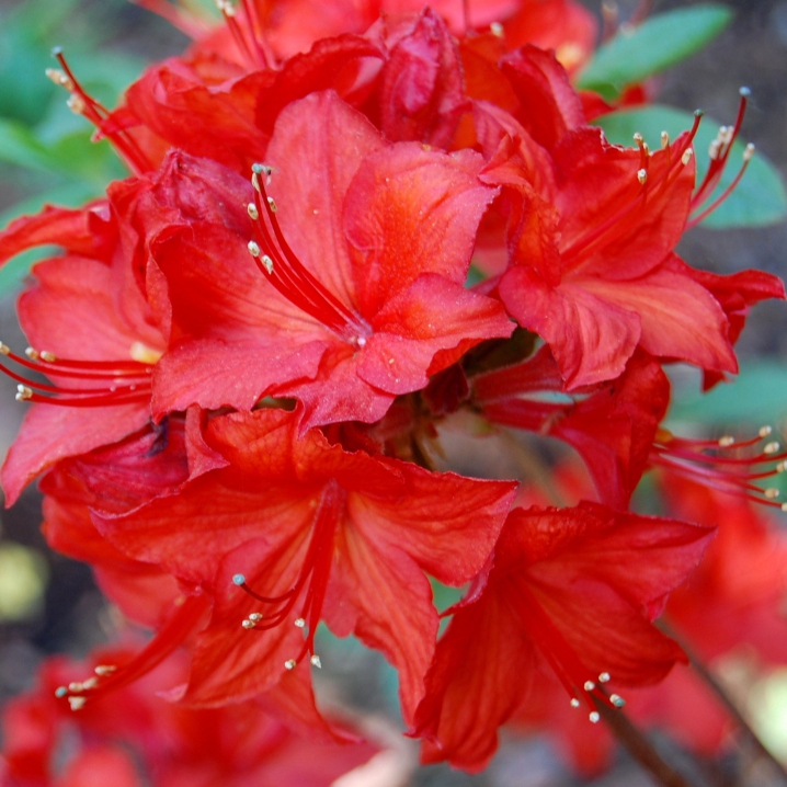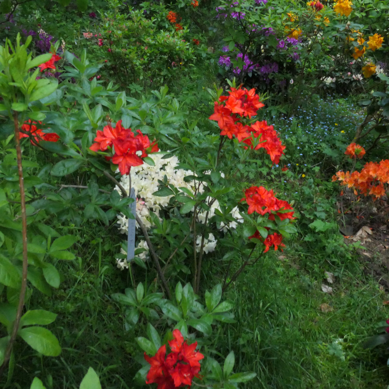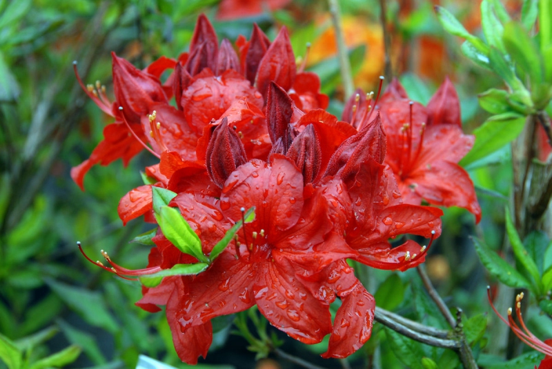 Eine blühende Azalee mit schönen roten Blüten. Blüht von Mai bis Juni, wird bis zu 2 m hoch und ebenso breit. Laubabwerfende Azaleen sind Heidepflanzen, die im Gegensatz zu den japanischen Azaleen volle Sonne lieben, sofern wir ihnen einen gleichmäßig feuchten, sauren Boden mit einem pH-Wert zwischen 4 und 5 bieten. Sie bevorzugen einen leichten, nicht kalkhaltigen, durchlässigen Boden mit Torf, Kompost und einer holzigen Mulchschicht an der Oberfläche. Schwere Böden werden durch Zugabe von Sand und feinem Borax aufgehellt. In schweren Lehmböden ist eine gute Drainage wichtig. Schneiden Sie die Blütenbüschel sofort nach der Blüte ab. Die Wurzeln dürfen nicht austrocknen.