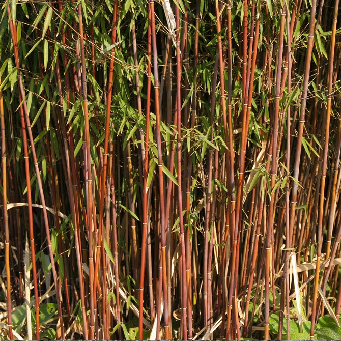Einer der schönsten Klone der Gattung Fargesia. Er bildet einen kompakten, säulenförmigen, sehr dekorativen, dichten Horst. Die Farbe der Halme verändert sich im Laufe des Jahres, von grün über gelb, orange bis hin zu rot und violett.