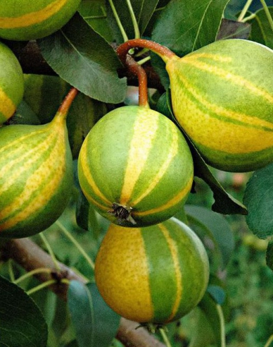 Die Schweizer Schlauchbirne gehört zu den Ziersorten und hat eine kurze Lagerfähigkeit. Die Sorte hat in einem Jahr mehr und im nächsten Jahr weniger Ertrag. Sie haben eine schöne dunkelgrüne Färbung und weiße Streifen.