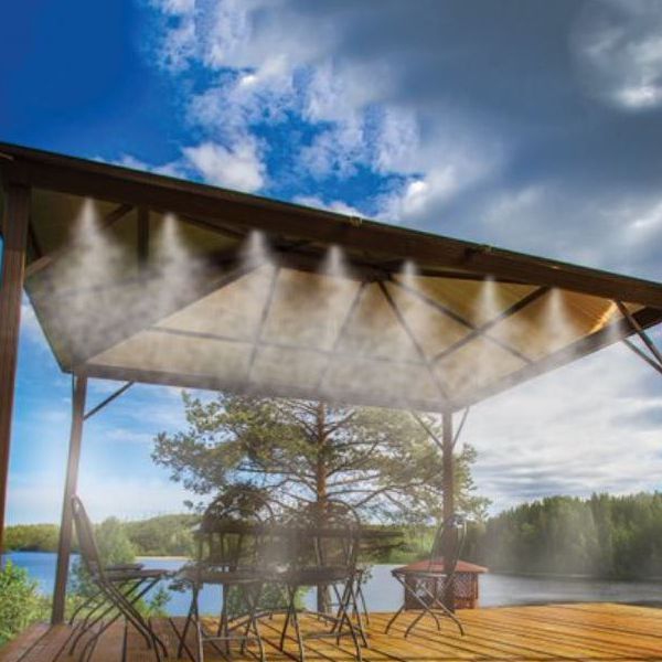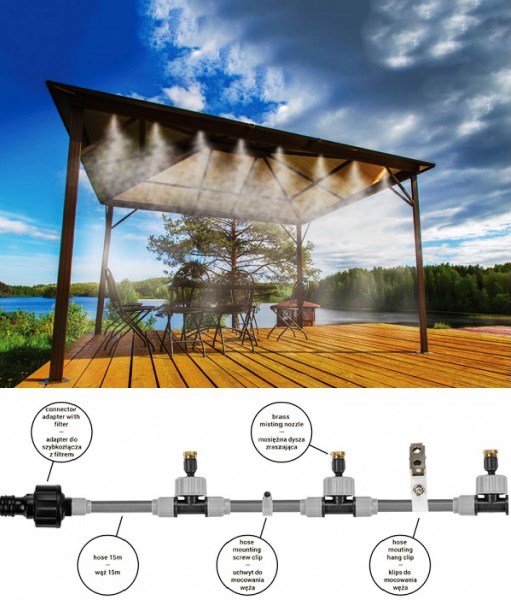 Der Lufterfrischer mit flexiblem Gelenk funktioniert nach dem Prinzip der Erzeugung eines feinen Wassernebels, der durch fünf Düsen erzeugt wird (der feine Wassernebel verdunstet schnell - daher haben die Wasserpfützen aus den Zerstäubern keine Zeit, sich zu bilden). Der Erfrischer wird mit Spannelementen am Zelt oder Pavillon befestigt. Er kühlt und erfrischt die Luft auf Ihrer Terrasse oder in Ihrer Gartenlaube um bis zu 10° - 12° C. Das Set kann mit Hilfe einer Schnellkupplung (nicht im Lieferumfang enthalten) an einen herkömmlichen Garten angeschlossen werden. Arbeitsdruck: 3-6 bar. Verbrauch max. 10 l / Stunde. Für den Anschluss an einen Gartenschlauch empfehlen wir den Kauf von Adaptern: für einen 1/2 Schlauch verwenden Sie die Kupplung WL-2140. Für den Anschluss an einen 3/4-Schlauch eignet sich die Kupplung WL-2140 oder WL-2150 (mit Stoppfunktion).