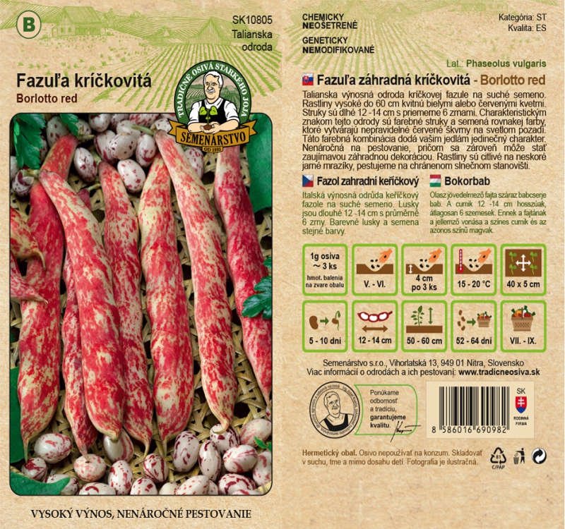 Italienische ertragreiche Sorte von Buschbohnen für Trockensamen. Die bis zu 60 cm hohen Pflanzen blühen mit weißen oder roten Blüten. Die Hülsen sind 12 bis 14 cm lang und enthalten durchschnittlich 6 Bohnen. Charakteristisch für diese Sorte sind die bunten Hülsen und die gleichfarbigen Samen, die unregelmäßige rote Flecken auf hellem Grund bilden. Diese Farbkombination verleiht Ihren Gerichten einen einzigartigen Charakter. Sie ist leicht anzubauen und kann auch eine interessante Gartendekoration darstellen. Die Pflanzen sind empfindlich gegen Spätfröste im Frühjahr, wachsen Sie an einem geschützten, sonnigen Standort.
