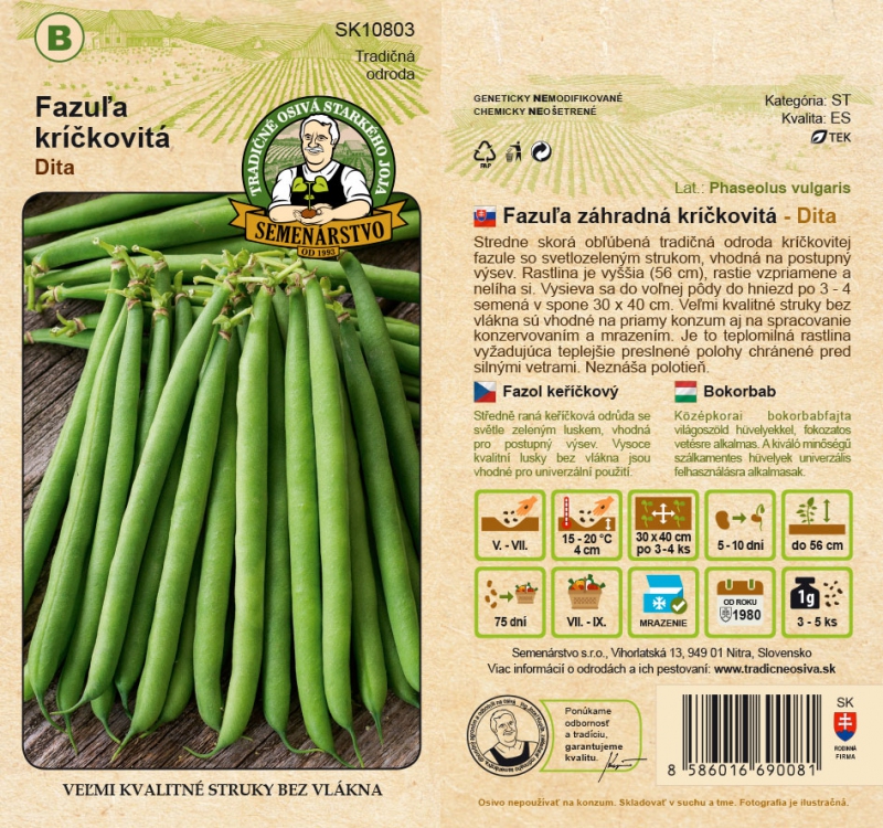Mittelfrühe, beliebte, traditionelle Sorte von Buschbohnen mit hellgrünen Hülsen, geeignet für die aufeinanderfolgende Aussaat. Die Pflanze ist größer (56 cm), wächst aufrecht und legt sich nicht hin. Sie wird in offenem Boden in Nestern von 3-4 Samen in einem Gelege von 30 x 40 cm ausgesät. Die hochwertigen, faserfreien Schoten eignen sich für den direkten Verzehr sowie für die Verarbeitung durch Einmachen und Einfrieren. Es handelt sich um eine wärmeliebende Pflanze, die wärmere, sonnige und vor starkem Wind geschützte Standorte benötigt. Sie verträgt keinen Halbschatten.