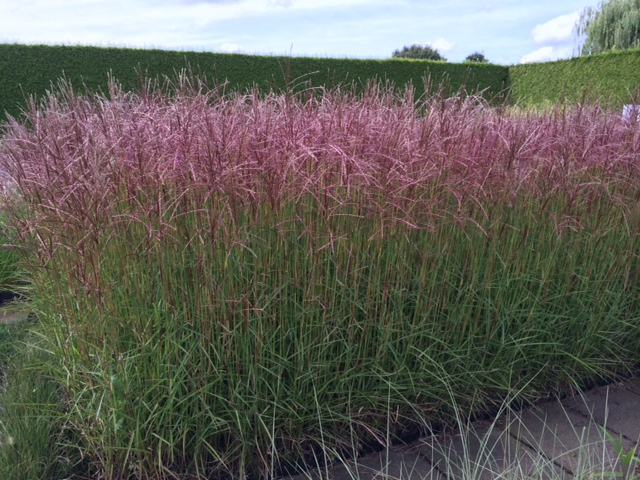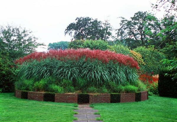 Miscanthus sinensis Ferner Osten ist eine mittelhohe Sorte (130-180 cm), deren hellgrüne Blätter mit einer weißen Aderung versehen sind. Die Blütenstände erscheinen im Spätsommer und sind bräunlich-maronenfarbig. Diese Blüten sind auch zum Trocknen geeignet.