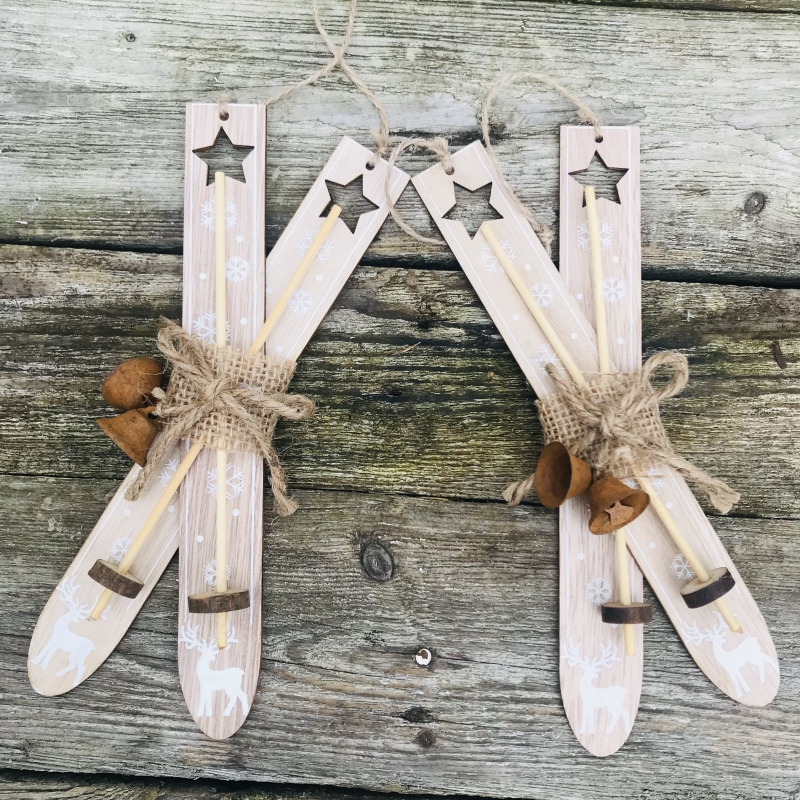 Einfach, aber mit einem besonderen Charme. Sie müssen die Skier nicht dekorieren, hängen Sie sie einfach an die Tür, stecken Sie sie an einen Kranz oder schmücken Sie den Weihnachtsbaum.