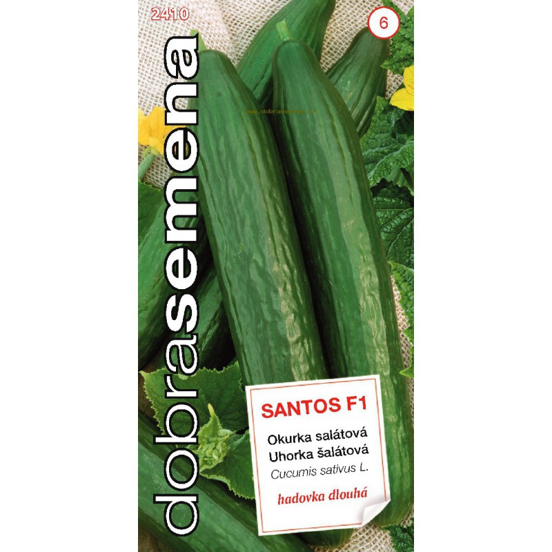 SANTOS F1 - eine lange parthenokarpische Schlangenkopfgurke für den Anbau in Gewächshäusern und Folienhauben. Eine ertragreiche Hybride für den Frühjahrs- und Herbstanbau mit 100% weiblichen Blüten. Die Frucht ist 30-35 cm lang, glatt, kurzhalsig, genetisch nicht bitter. Die Pflanze ist resistent gegen Cladosporium und tolerant gegenüber dem Gurkenmosaikvirus.