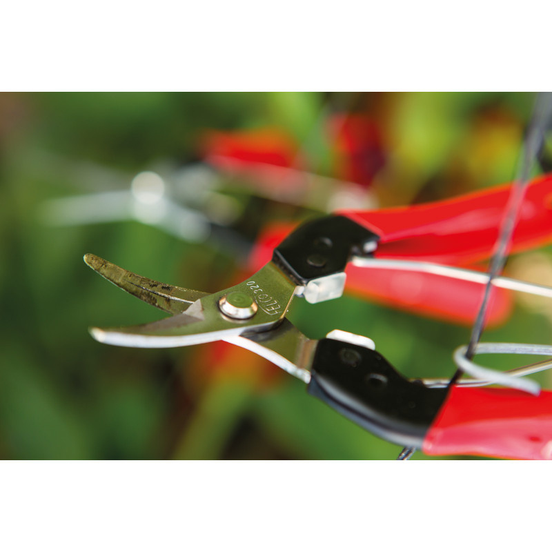 Die kompakte und extrem einfach zu handhabende Schere ist für Erntearbeiten konzipiert. Der abgewinkelte Schneidkopf ermöglicht ein bequemes und sicheres Schneiden von Obst-, Blumen- und Kräuterstängeln. Die weichen Polyurethan-Stoßdämpfer reduzieren die Muskelbeanspruchung beim Greifen und schonen die Hände. Die Klingen aus Kohlenstoffstahl sind zum Schutz vor Korrosion und für einen glatten Arbeitskopf vernickelt.