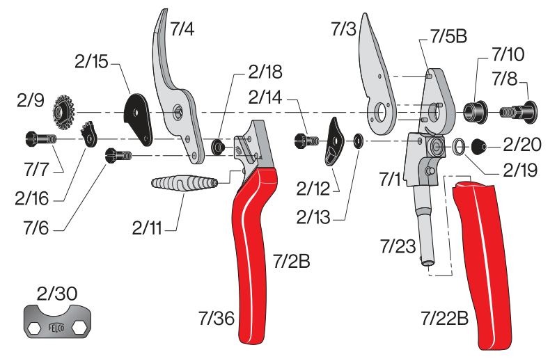 Felco 7 - ergonomisches Modell mit verbessertem Drehgriff. Um den Kraftaufwand beim Schneiden zu verringern und Sehnenentzündungen vorzubeugen, ist der Scherkopf der Schere abgeschrägt. Die Felco 7 ist mit einem schwenkbaren Griff ausgestattet, der den Kraftaufwand um 30% reduziert und das Schneiden noch komfortabler macht.