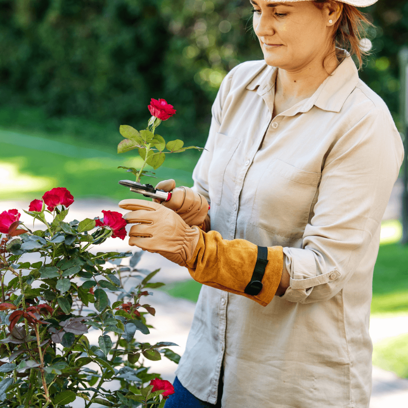 Lederhandschuhe FELCO 705 für alle Züchter und Liebhaber von Rosen. Die Handschuhe sind so konzipiert, dass sie nicht nur die Handflächen, sondern auch die Unterarme bei der Arbeit mit Rosen schützen. Sie eignen sich auch für die Arbeit mit anderen Pflanzen, die Dornen haben (z.B. Himbeeren, Brombeeren, Sanddorn...). Das weiche und sehr angenehme Rindsleder ist geschmeidig in der Bewegung und gleichzeitig sehr haltbar im Schutz der Hände vor Rosendornen. Der Unterarm des Handschuhs besteht aus Rindsvelours und ist oben mit einer Schnalle zum Festziehen versehen.