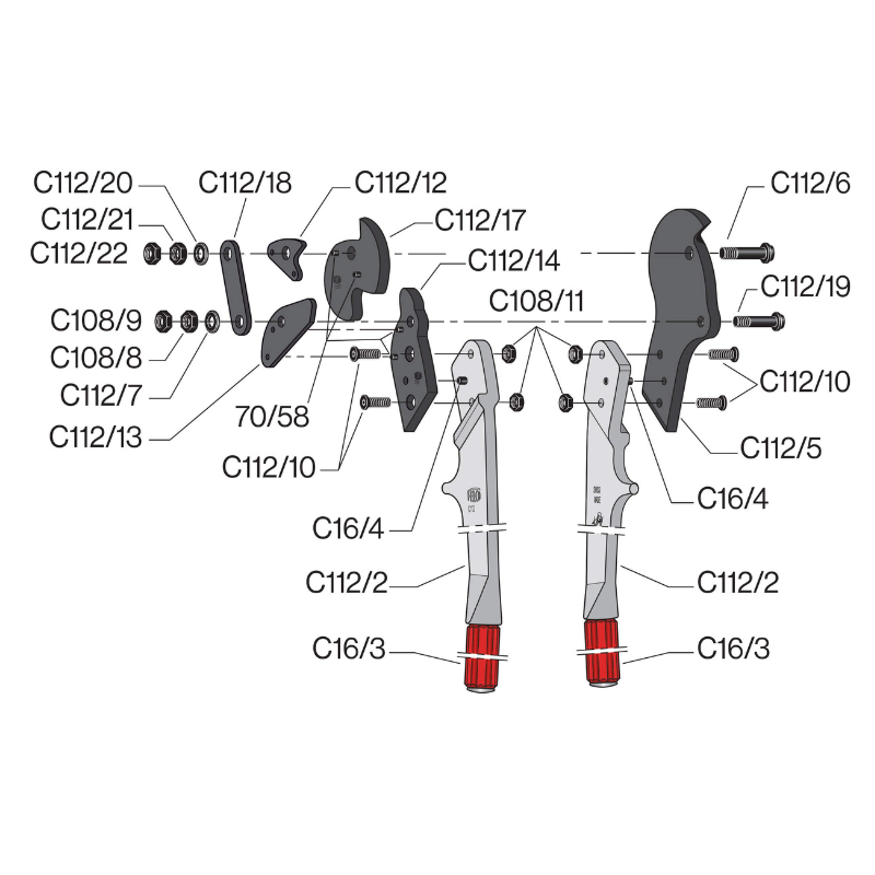 FELCO C112 Zange zum Schneiden von sehr harten Materialien, Draht und Stahlseilen bis zu 12,7 mm Durchmesser. Sie sind mit einem Kraftübertragungssystem ausgestattet, das es ermöglicht, die vom Benutzer ausgeübte Kraft zu erhöhen. Diese Scheren sind vor allem für die Erdöl-, Forst-, Energie-, Transport- und Telekommunikationsindustrie bestimmt.