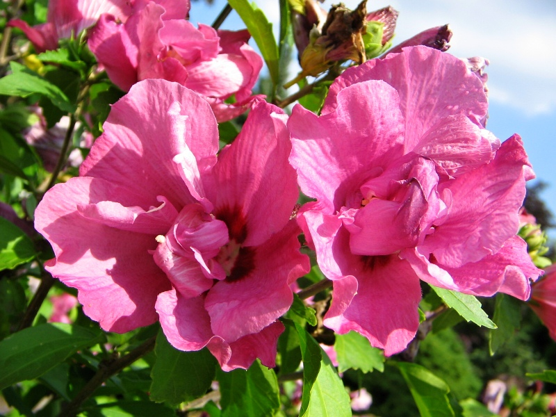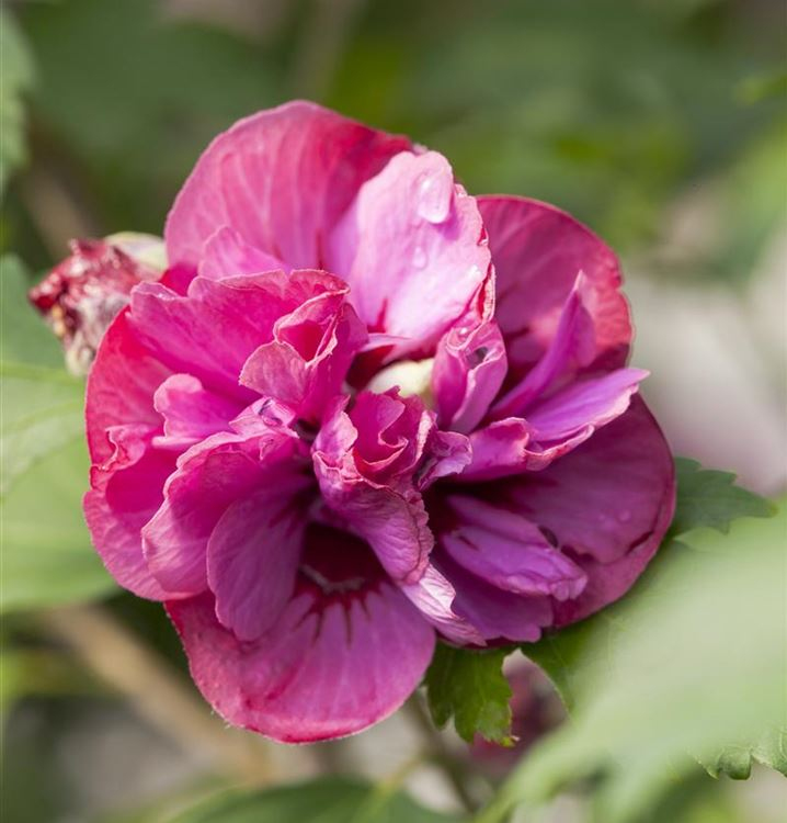 Die Sorte Duc de Brabant ist ein perfekter Hibiskus mit einer noch nie dagewesenen vollen Blüte. Er blüht vom Frühsommer bis zum späten September mit flauschigen, gekräuselten rosa Blüten. Sie sind so gefüllt, dass man nicht einmal die Staubgefäße sehen kann
