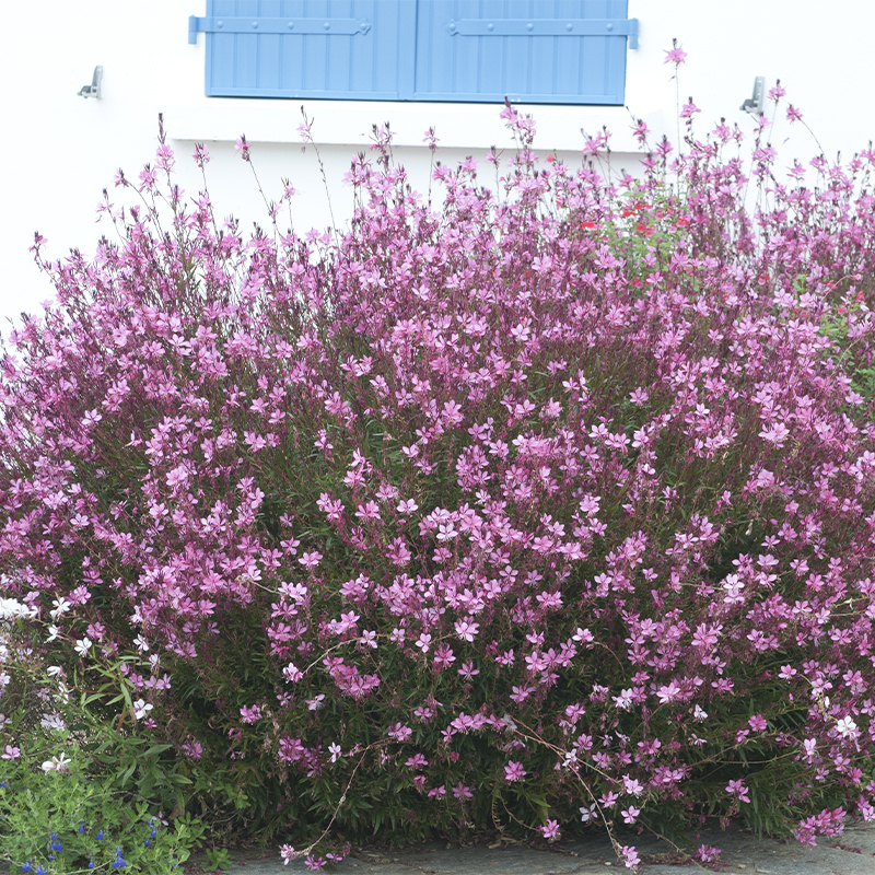 Gaura ist in den amerikanischen Prärien beheimatet, aber wir sehen sie zunehmend in unseren Gärten. Ihre langen Triebe mit den kleinen Blüten eignen sich gut für Mischpflanzungen mit anderen Stauden und einjährigen Pflanzen, aber Gaura macht sich auch als Solitär gut. Gaura Siskiyou wird Sie mit ihren zartrosa Blüten und grünen Blättern ansprechen.