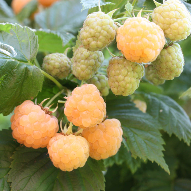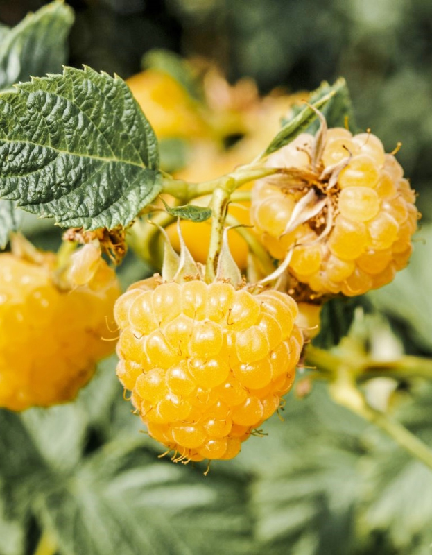 SUGANA GELB - die Früchte sind bis zu 2,5 Zentimeter groß, kegelförmig, aromatisch und süß. Die Früchte reifen an ein- und zweijährigem Holz. Die erste Ernte erfolgt ab Mitte Juni und die zweite ab Mitte August. Sie gehört zu den gelben Himbeersorten, die das ganze Jahr über Früchte tragen. Das erfrischende Aroma der Beeren macht sie besonders geeignet für Säfte, Marmeladen oder Desserts. Gelbe Himbeeren sind reich an den Vitaminen A, B, C, E, K und Mineralstoffen. Diese Frucht gibt Energie und stärkt das Immunsystem. Die Früchte sind bis tief in den Herbst hinein überraschend süß und aromatisch.