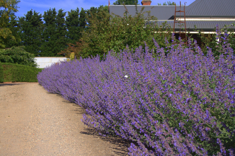 Nepeta grandiflora Six Hills Giant ist eine hochwachsende Rohrkolbenart mit graugrünem Laub. Ab dem späten Frühjahr, fast bis zum Frost, erscheinen blassviolette Blüten an den Pflanzen, die gerne von nützlichen Insekten gefressen werden.