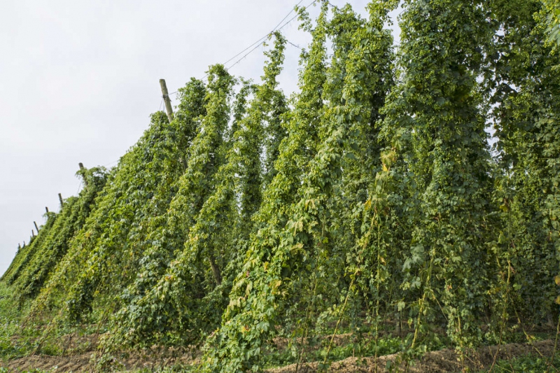 Hopfen ist eine mehrjährige Liane, deren Rhizom den Winter in Form von Knospen im Boden überdauert. Die stark behaarten (hakenförmigen) rechtshändigen Zwiebeln, die sich um benachbarte Pflanzen wickeln, sind etwa 6 m lang. Die Blätter sind kreuzweise gegenständig und stehen bei den weiblichen Exemplaren in zwei Reihen in der Nähe des Blütenstandes. Die Blätter haben einen langen Blattstiel und sind 3-7-fach gelappt. Die Oberseite ist dunkelgrün und grob behaart, die Unterseite ist heller. Der Hopfen ist zweihäusig (männlich und weiblich). Die männlichen Blüten bilden lange Quirle. Die weiblichen Blüten sitzen paarweise in den Achseln der Hüllblätter in kurzen Rispen und verwandeln sich bei der Reife in nussgroße, hängende Dolden.