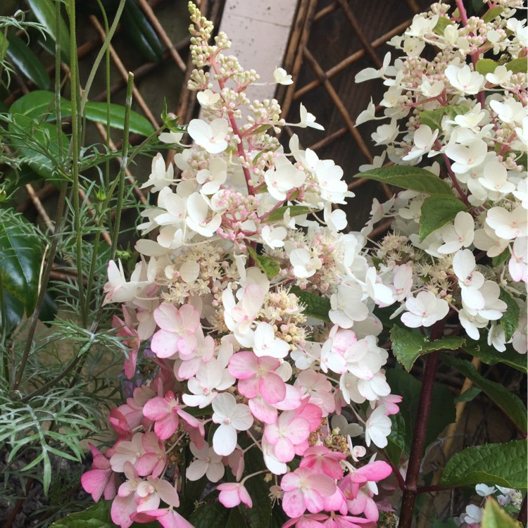 Hortensie mit großen Blütenständen von cremegelber Farbe, die sich mit der Zeit in ein tiefes Rosa verwandelt.
