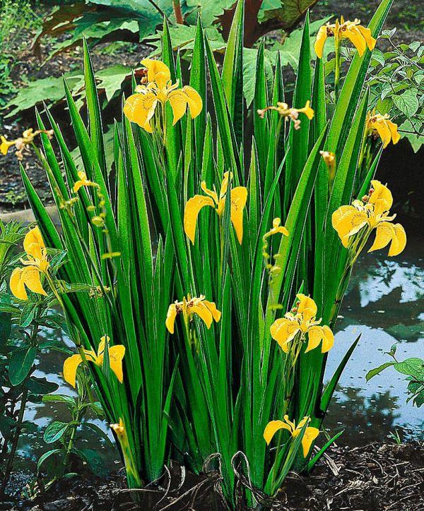 Die Gelbe Korbweide ist eine mehrjährige Pflanze, die in ganz Europa an Teichufern und an staunassen Stellen wächst. Sie gehört zur Familie der Iridaceae - Schwertliliengewächse. Die Sorte Variegata ist eine prächtige Schwertlilie mit interessanten, gelben Blättern, die die Pflanze während der gesamten Vegetationsperiode schmücken und im Winter nicht abfallen. Die leuchtend gelben Blüten mit brauner Aderung in der Mitte erscheinen von Mai bis Juli. Sie sind 10 cm groß. Die ganze Pflanze erreicht eine Höhe von 70-80 cm. Die Gelbe Schwertlilie bevorzugt einen sonnigen Standort, kann aber auch Halbschatten vertragen. Der Boden sollte feucht bis überschwemmt und nährstoffreich sein. Sie kann in einen Teich gepflanzt werden, in stehendes oder leicht fließendes Wasser bis zu einer Höhe von 5-15 cm. Sie ist von unschätzbarem Wert, wenn es darum geht, stickstoffhaltige Verbindungen aus dem Wasser zu entfernen und so übermäßiges Algenwachstum zu verhindern. Sie braucht keinen Winterschutz.