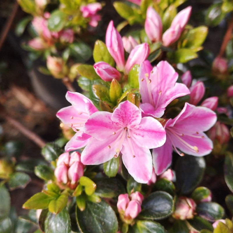 Japanische Azaleen sind eine sehr beliebte Bereicherung für unsere Gärten. Sie können durch Schnitt in Form gebracht werden, am besten im Juni, damit sie Zeit haben, Blütenknospen für die nächste Saison zu bilden. Sie brauchen einen leichten, sauren, sehr durchlässigen und möglichst konstant feuchten (nicht staunassen) Boden, der reich an Eisen und Phosphor ist. Verwenden Sie Spezialdünger für Rhododendren und Azaleen, eventuell auch für Heidepflanzen. Am besten ist es, den Boden ständig zu mulchen, um die Feuchtigkeit zu halten. Die Azalee Kermesina Rose ist ein Muss für alle, die bunte oder mehrfarbige Blüten mögen. Sie sind rosa und haben einen reinweißen Rand. Die Blätter sind mittel- bis dunkelgrün, eiförmig und nur etwa 2-3 cm lang. Im Halbschatten und Schatten bleiben sie den ganzen Winter über am Strauch, in voller Sonne können sie verloren gehen. Nach der Blüte erscheinen neue Blätter.