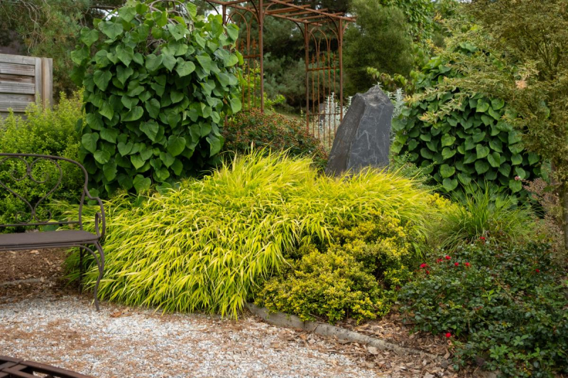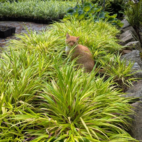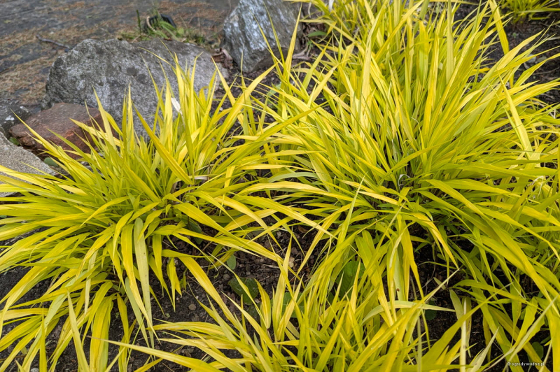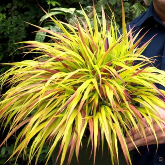 Hakonechloa macra Sunflare ist eine Sorte mit gelbem Laub, das sich im Herbst an den Spitzen rot färbt. Die grünen Blüten sind zart und erscheinen im späten Frühherbst. Sie eignet sich ideal für die Unterpflanzung von Bäumen, Beeten und Steingärten. In Japan ist es auch eine wertvolle Kübelpflanze, die langsam wachsende Büschel mit breiten, hängenden Blättern bildet. Ein kleiner Nachteil dieses Grases ist, dass es im Winter verblüht, aber wenn man es im Frühjahr bis auf den Boden zurückschneidet, wird es uns im Frühjahr mit neuen Blättern belohnen. Es wird etwa 40 cm hoch und 40 cm breit. Es ist frostbeständig bis zu -20 Grad Celsius.