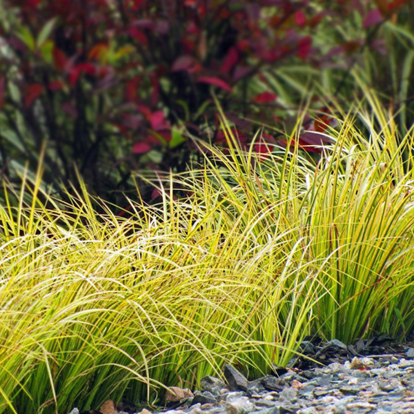 ‚Golden Delight‘ ist eine besonders attraktive, immergrüne Sorte mit hohem Zierwert. Die schmalen, hellgrünen Blätter sind mit einem markanten gelben Streifen versehen und bilden dichte, elegant gefächerte Büschel. Im Mai schmückt sich die Pflanze mit grünlich-gelben, ährenförmigen Blüten. Ideal als Strukturpflanze im Beet, für Steingärten oder als Blickfang im Kübel.