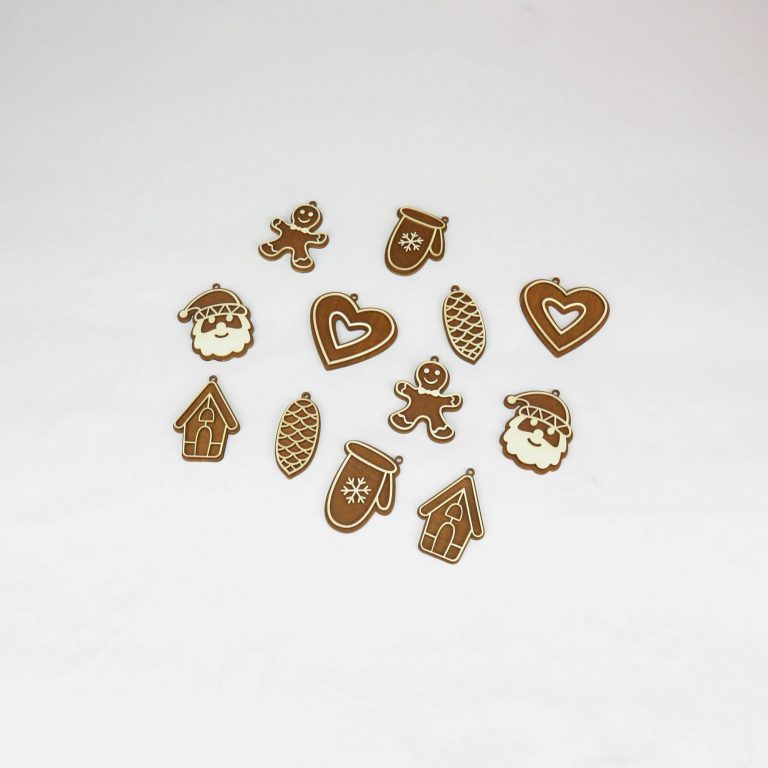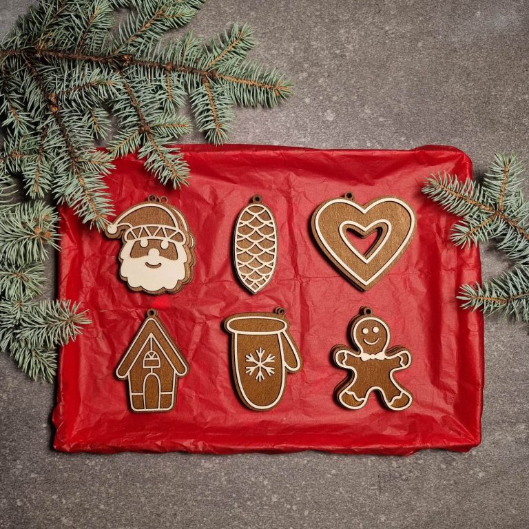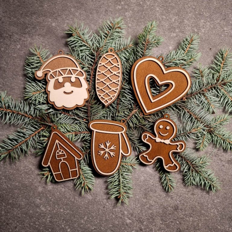 Laser-geschnitzte Ornamente aus einer Kombination von gebeiztem und ungebeiztem Sperrholz.