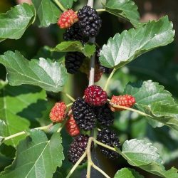 Morus (Morus nigra) Trnava ist eine der beliebtesten Sorten wegen ihrer großen schwarzen Früchte (3-5cm) mit hohem Kohlenhydratgehalt. Sie reift allmählich, ab der zweiten Julihälfte bis August. Sie hat dunkelrote bis schwarze Früchte. Der Baum ist von schwächerer Statur.