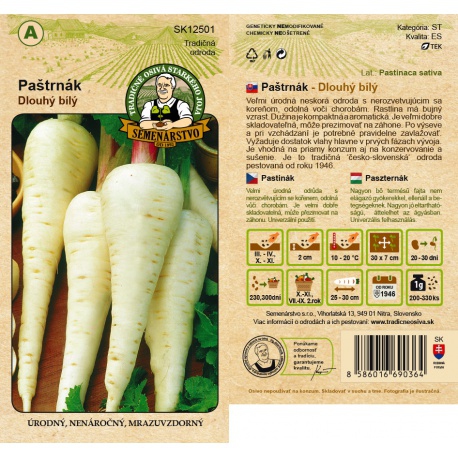 Eine sehr produktive Spätsaison-Sorte mit einer nicht verzweigenden, krankheitsresistenten Wurzel. Die Pflanze hat eine kräftige Wuchsform. Das Fruchtfleisch ist kompakt und aromatisch. Sie ist sehr lagerfähig und kann im Beet überwintern. Nach der Aussaat und während des Auflaufens muss sie regelmäßig bewässert werden. Sie benötigt ausreichend Feuchtigkeit, vor allem in den ersten Entwicklungsphasen. Er eignet sich für den direkten Verzehr, zum Einmachen und Trocknen. Es handelt sich um eine traditionelle tschechisch-slowakische Sorte, die seit 1946 angebaut wird.