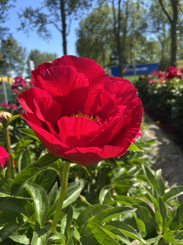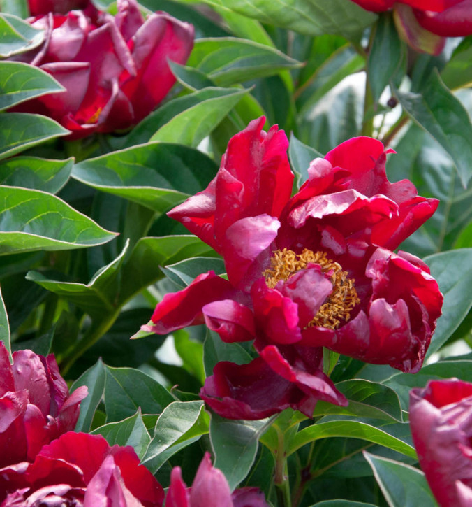 Paeonia Blaze ist eine auffällige, leuchtend rote Sorte der einfachen Staudenpfingstrose. Die Blüten entfalten sich im späten Frühjahr und eignen sich für den Schnitt in Vasen und Arrangements.