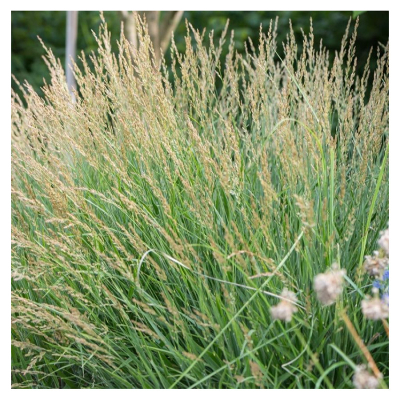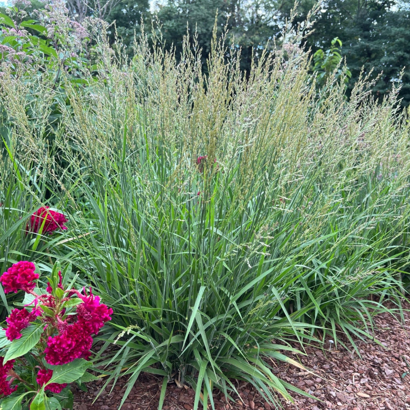 Diese kürzere Hybride, die ein wenig wie ein Zwerg Karl Foerster aussieht, bildet einen dichten Hügel aus grünem Laub, der später in der Saison von vielen goldbraunen Blütenständen gekrönt wird.