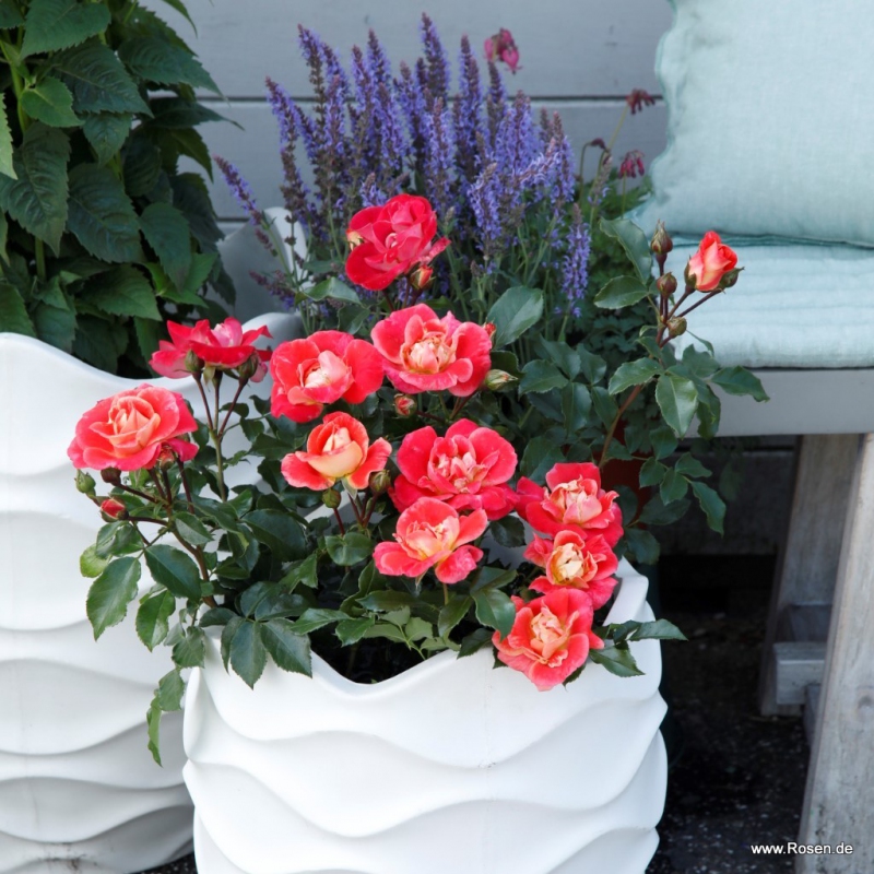 Die Airbrush-Rose ist eine wunderschöne Rose mit einem Ausbruch von orangefarbenen Blüten. Perfekt geformte, mittelgroße Blüten, wie mit einem Pinsel gemalt. Sie hat einen aufrechten, dichten Wuchs mit glänzend grünen Blättern. Sie macht sich sehr gut in gemischten Gruppenpflanzungen oder im Topf auf dem Balkon oder der Terrasse.