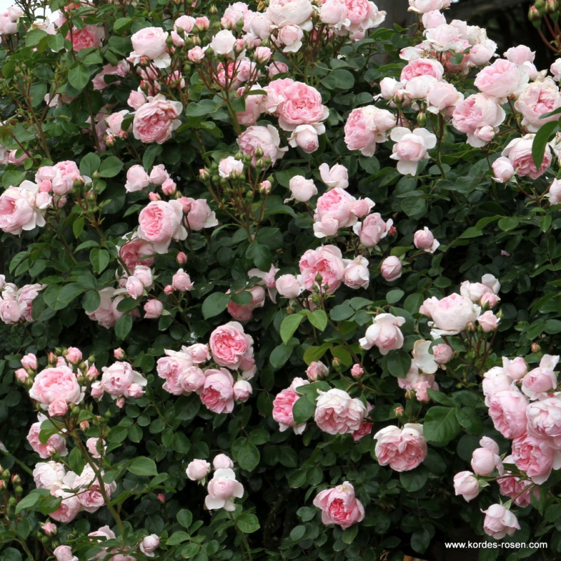 Busch in einem schönen zarten Rosa, mit dem Charme der alten Rosen. Er ist mit sehr gesundem Laub und einer nostalgischen Blütenform ausgestattet, die in Baden-Baden, Genf und Rom mit Goldmedaillen ausgezeichnet wurde.