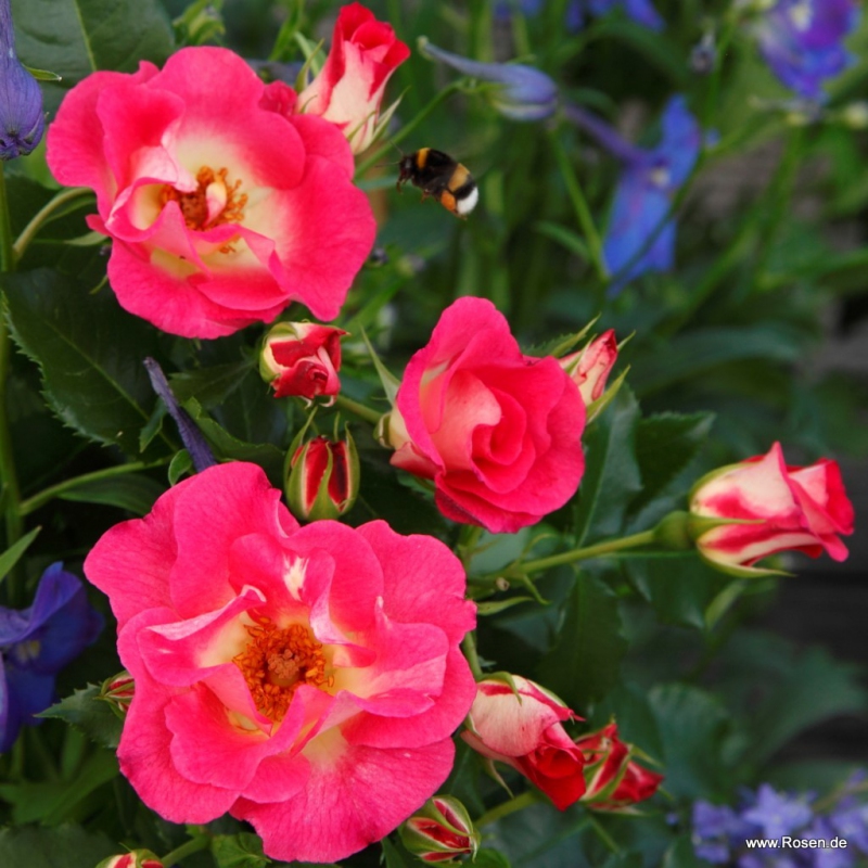 Diese neue mehrblütige Rose besticht durch die Größe der Blüten, die einfach, aber wunderschön gefärbt sind, von Weiß bis zu Rosatönen an den Rändern der großen Blüte. Die Zentren sind orange-rot und verschmelzen wunderschön mit dem Rosa der Blütenblätter.