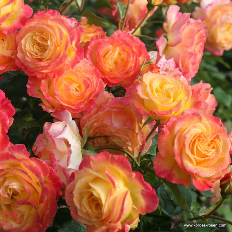 Diese Floribunda ist ein wahrer Schatz in der Landschaft, mit viel Farbe und sehr gesundem Laub. Die hochkonzentrierten Knospen öffnen sich zu einem gefüllten Blütenbecher, dessen gelbe Mitte von intensiv roten Rändern umgeben ist. Sie hat mehrere Preise gewonnen, darunter den City of Adelaide Award, den Peoples Choice Award und den City of Glasgow Gold Award.