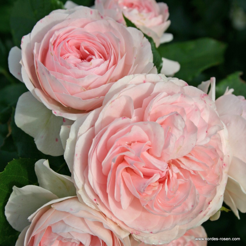Die bodendeckende Sorte Larissa hat zarte Blüten in zartem Rosa, die sich zu reichen Blütenkugeln entwickeln, die in ihrer Form an Pfingstrosen erinnern. Eine üppig blühende, mehrblütige Rose mit sehr gefüllten, romantischen Blüten, die während der Blütezeit leicht zu reinigen sind. Sie gewann die Goldmedaille in Kortrijk 07.