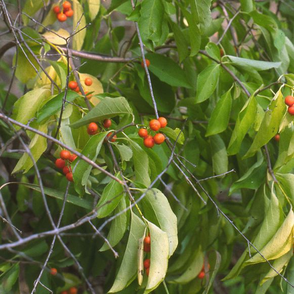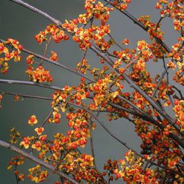 Sie hat keine ausgeprägte Blüte, dafür aber interessante ähnliche Blätter und vor allem die Früchte, die im Herbst aufplatzen und ihr gelbes Inneres mit roten Samen zum Vorschein bringen.