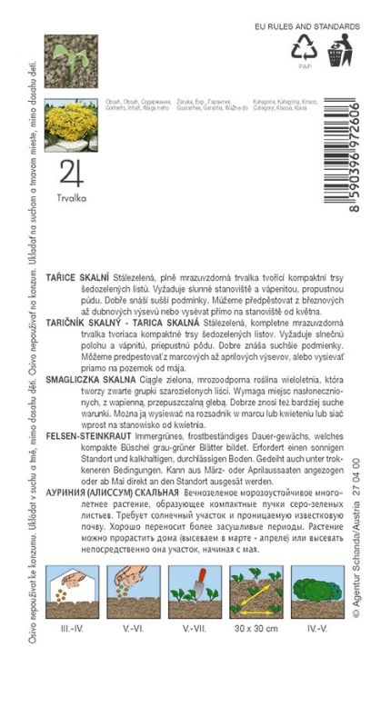 Die strauchartige Staude eignet sich besonders für Steingärten und Beetbepflanzungen. Die Blätter sind eiförmig, behaart, grau-grün. Die Blütentrauben bestehen aus kleinen, gelben, vierblättrigen Blümchen. Sie benötigt volle Sonne und einen gut durchlässigen Boden. Verträgt auch trockenere Standorte. Goldgelbe Blüten, kompakte Pflanzen, 25 cm hoch.