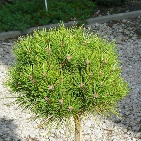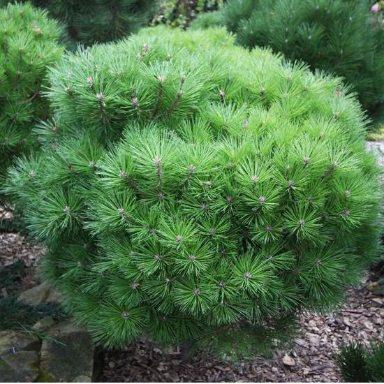 Eine sehr begehrte Zwergkiefer-Sorte. Sie wächst regelmäßig und hat eine kompakte kugelförmige Krone. Ideal für Steingärten und Mischpflanzungen als dominante Pflanze.