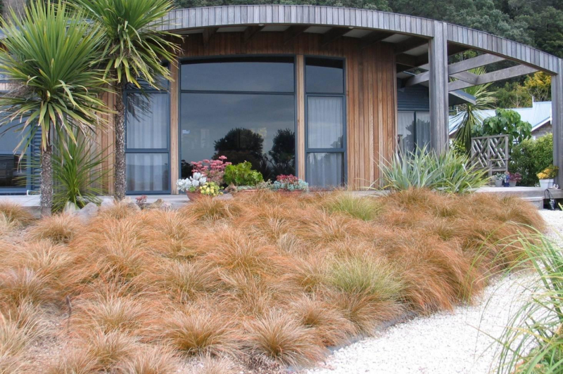 Carex testacea Prairie Fire - eine attraktive Segge, die direkte Sonne verträgt. Sie hat schmale, lange, grüne, hängende Blätter, die sich an den Enden orange verfärben. Im Herbst färbt sich die ganze Pflanze karamell-orange bis braun. Im späten Frühjahr erscheinen hellgrüne Blüten an den Pflanzen. Da es sich um ein immergrünes Ziergras handelt, ist es besser, es bei stärkerem Frost ohne Schnee mit Chicorée oder Laub abzudecken.