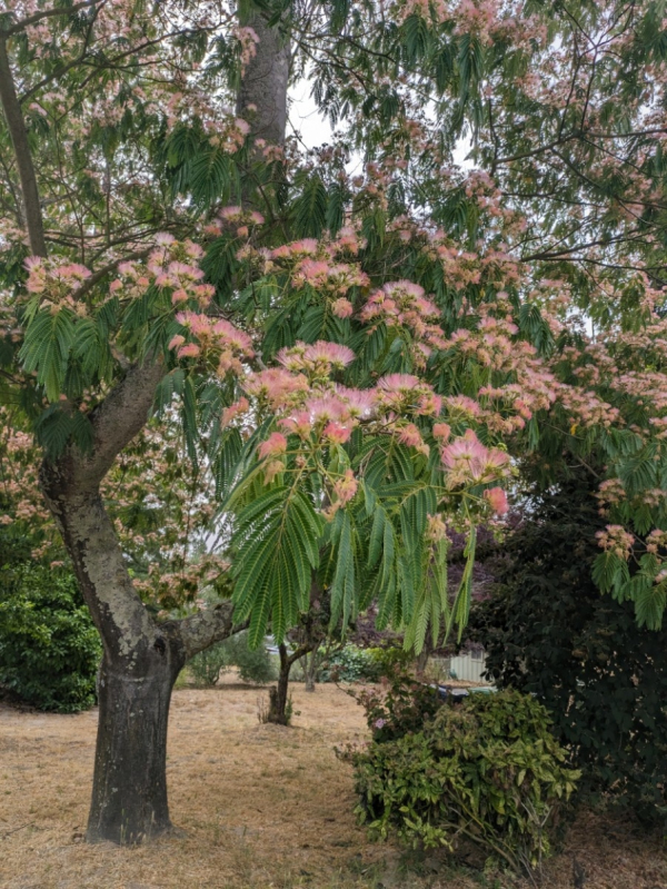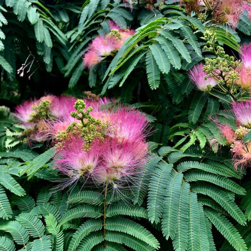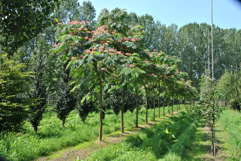 Die sehr feinen farnartigen Blätter sind die Hauptdomäne dieses regenwurmartigen Baumes. Die Blätter schließen sich bei Nacht und bei Regen. Die dunkelrosa Blüten mit langen Staubgefäßen blühen im Spätsommer. Wählen Sie einen mittelschweren Boden mit ausreichender Durchlässigkeit. Die Albizia mag sonnige, warme und geschützte Standorte. Sie darf nie längere Zeit im Wasser stehen. Im Winter muss sie gut beschattet werden.