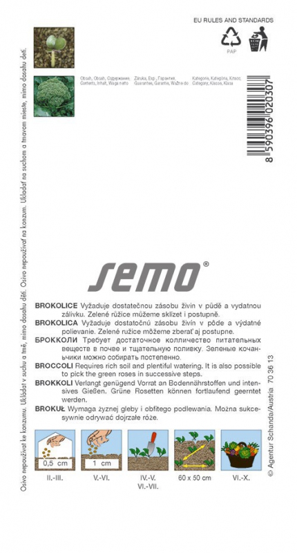 Vorzeigbare Sorte des Stammtyps für die sukzessive Ernte von Rosetten. Die Pflanze ist zur Reifezeit reich verzweigt, die zentralen Rosetten haben einen Durchmesser von 8-10 cm, die seitlichen Rosetten - die aus den Blattachseln wachsen - sind kleiner. Die Wachstumszeit von der Aussaat bis zur Ernte beträgt 80-120 Tage.