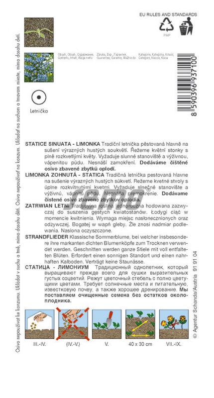 Gerade, dicht verzweigte Einjährige, die hauptsächlich zum Trocknen bestimmt sind. Bildet eine am Boden wachsende Rosette aus lanzettlichen, gelappten Blättern und kleinen Blüten in dichten Blütenständen an geflügelten Stängeln. Die Blütenstängel werden nach und nach geerntet (voll erblüht) und im Schatten getrocknet. Die frischen Blüten können auch als Schnittblumen für Vasen verwendet werden. Sie benötigt einen vollsonnigen Standort, im Halbschatten blüht sie schlecht. Sie verträgt keine Staunässe. Hellblau, Höhe 70 cm.