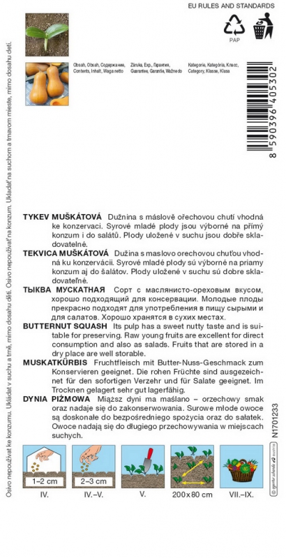 Butternusskürbis mit kleinen birnenförmigen Früchten von hellgrüner, später ockerfarbener Farbe, die 1 - 1,5 kg wiegen. Ein kleiner Hoden befindet sich nur im Kopf der Frucht. Bei früher Reife ist das Fruchtfleisch cremeweiß bis hellgelb, mit einem buttrig-nussigen Geschmack, enthält wenige Kerne und ist bei voller Reife leuchtend orange. Das Fruchtfleisch hat eine butterartige Konsistenz und einen angenehm nussigen Geschmack. Ein weiterer Vorteil dieser Sorte ist ihre Frühreife. Pro Pflanze gibt es 3-5 Früchte. Sie wird zum Einmachen verwendet, die rohen jungen Früchte eignen sich für den direkten Verzehr, verschiedene Kochzubereitungen, sind hervorragend für Suppen und eignen sich auch für Salate.