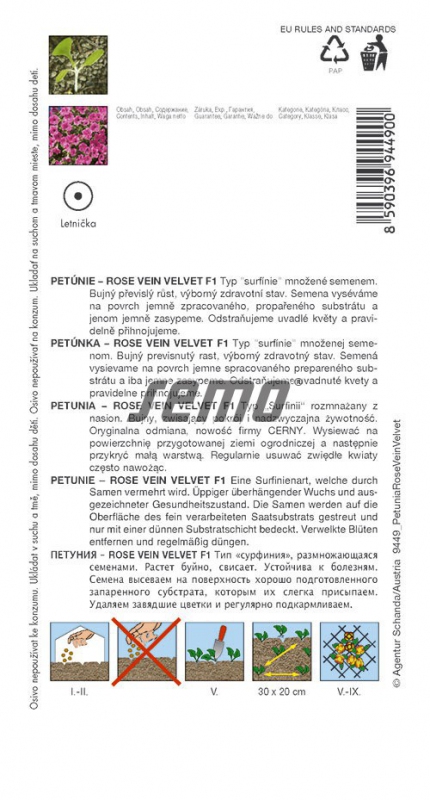 Petunia Typ Surfinia Rose Vein Velvet F1 ist eine neue Petunie mit großem Überhang Typ Surfinia, aus der Zucht tschechischen Firma Petunia Černý aus Jaroměř. Die rosafarbenen Blüten haben eine dunkelrosa Aderung im Eileiter der Blüte. Reicher Überhang, lange Blütezeit und Widerstandsfähigkeit gegen Wetterkapriolen sind die Vorzüge dieser Sorte. é