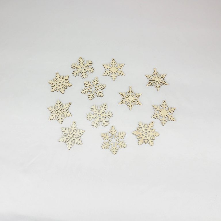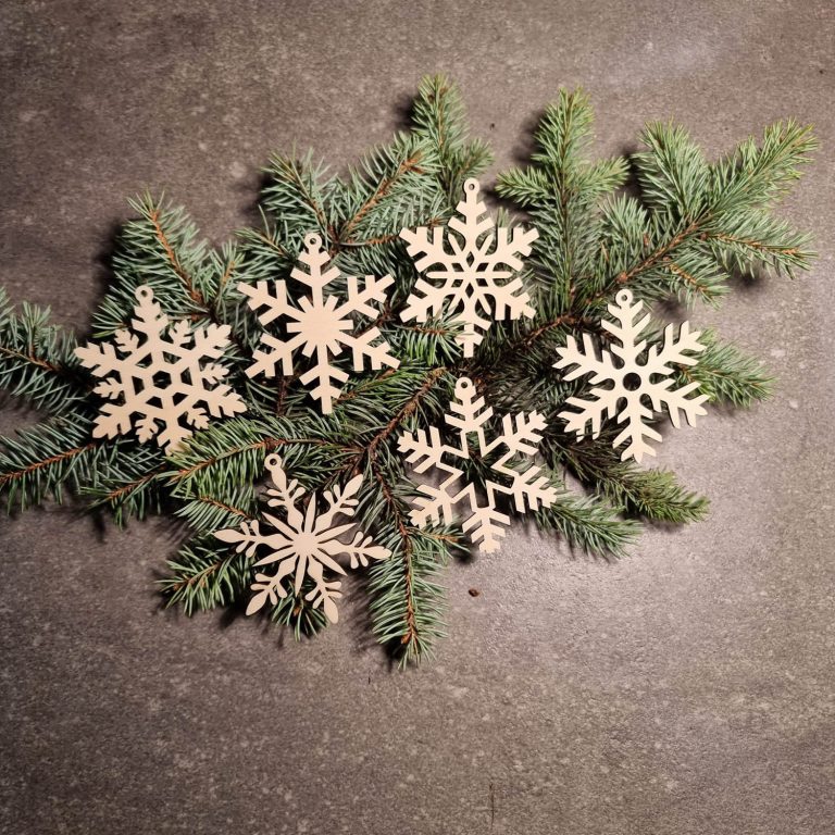 Laser-geschnitzte Ornamente aus einer Kombination von gebeiztem und ungebeiztem Sperrholz.