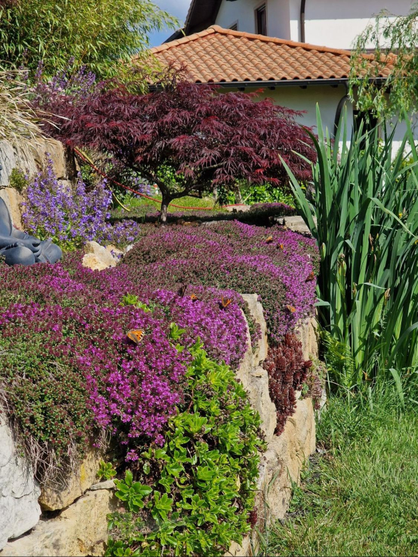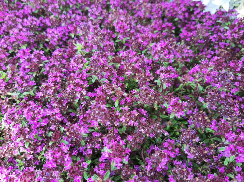 Die Skalbeere wächst in ganz Europa und reicht über die Türkei bis in den Kaukasus. Hierzulande ist sie vor allem in Gebirgsregionen heimisch. Sie bildet niedrige, kriechende Teppiche aus fein behaarten Blättern. Thymus praecox Red Carpet ist eine Sorte von tiefrosa Farbe. In der zweiten Frühjahrshälfte erscheint eine Flut von zarten, violetten Blüten. Die ganze Pflanze ist aromatisch. Sie wird für die Bepflanzung von Steingärten und Trockenmauern verwendet. Trockenheits- und Trittfestigkeit sind wertvolle Eigenschaften. Sie wird daher als Rasenersatz verwendet.