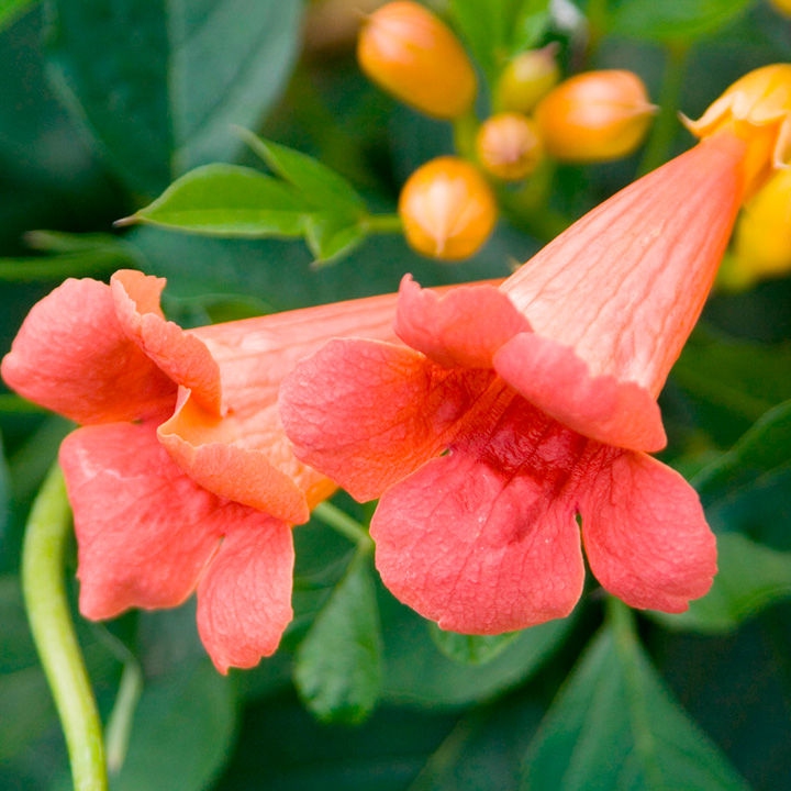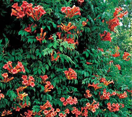 Eine schöne unprätentiöse Kletterpflanze, die ihren Namen von ihren trompetenförmigen Blüten hat. Sie sind groß und ausgeprägt und kommen auf Pergolen sehr schön zur Geltung. Die Pflanze verträgt auch die Sonne gut und ist anspruchslos an den Boden.