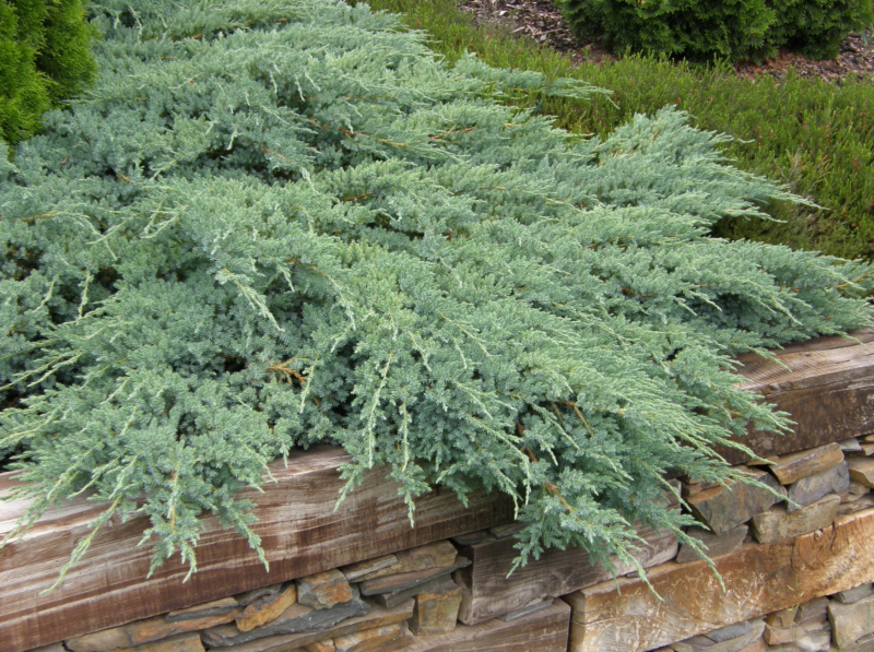 BLUE CARPET ist ein kriechender, relativ schnellwüchsiger, nadeliger Strauch, der einen dichten Teppich bildet. Nach 10 Jahren erreicht er eine Höhe von etwa 50 cm und einen Durchmesser von 150-200 cm. Der Strauch hat steife, leicht aufragende Triebe, die sich seitlich ausbreiten. Die Nadeln sind kurz, stachelig, von blaugrauer Farbe und mit einer wachsartigen Schicht überzogen. Er gedeiht gut in allen leichten und durchlässigen Böden. Ein sonniger oder halbschattiger Standort ist ideal.