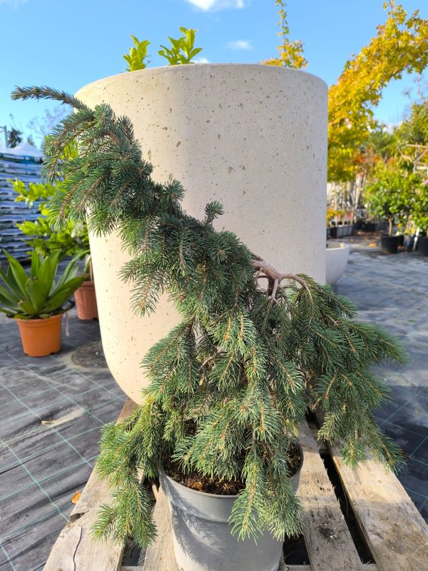 Helle, silberblaue Nadeln, die von kaskadenförmigen Ästen getragen werden, verleihen diesem Trauerbaum ein anmutiges Aussehen und eine schöne Farbe. Junge Pflanzen können frei stehen gelassen werden, um eine wilde, fast bodenbedeckende Pflanze zu schaffen.