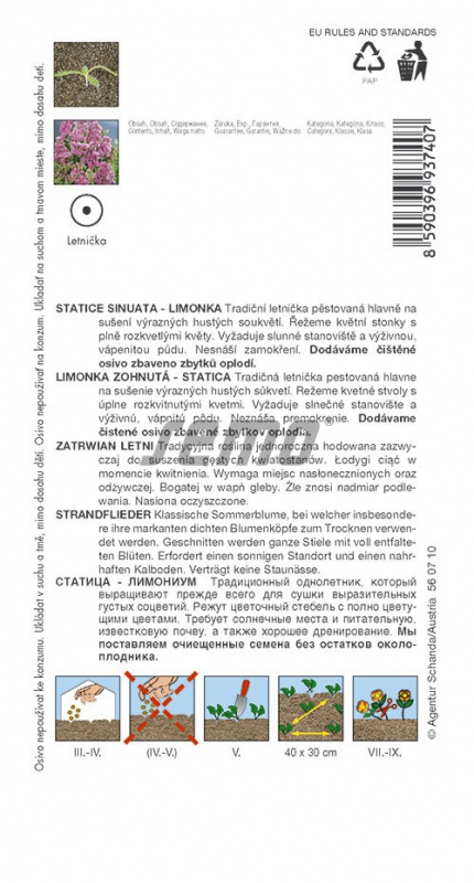 Gerade, dicht verzweigte Einjährige, die hauptsächlich zum Trocknen verwendet werden. Bildet eine am Boden wachsende Rosette aus lanzettlich gelappten Blättern und kleinen Blüten in dichten Blütenständen an geflügelten Stängeln. Die Blütenstängel werden nach und nach geerntet (voll erblüht) und im Schatten getrocknet. Frische Blüten können auch zum Schneiden in Vasen verwendet werden. Sie benötigt einen vollsonnigen Standort und blüht schlecht im Halbschatten. Staunässe verträgt sie nicht. Rosa, Höhe 80 cm.
